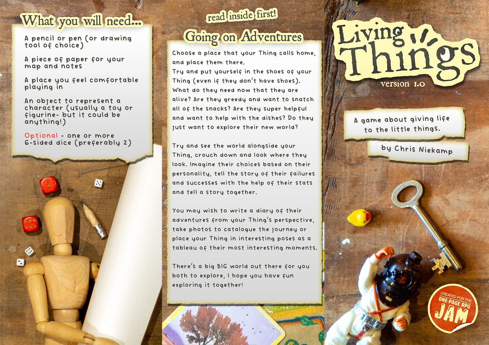 Once you have your Place, you find a characterful object that inhabits your Place- this will be your ‘Living Thing’ (or ‘Thing’ for short). Your Living Thing will take on a set of skills that will help it face new challenges and survive in the enormous new world it has found itself in.